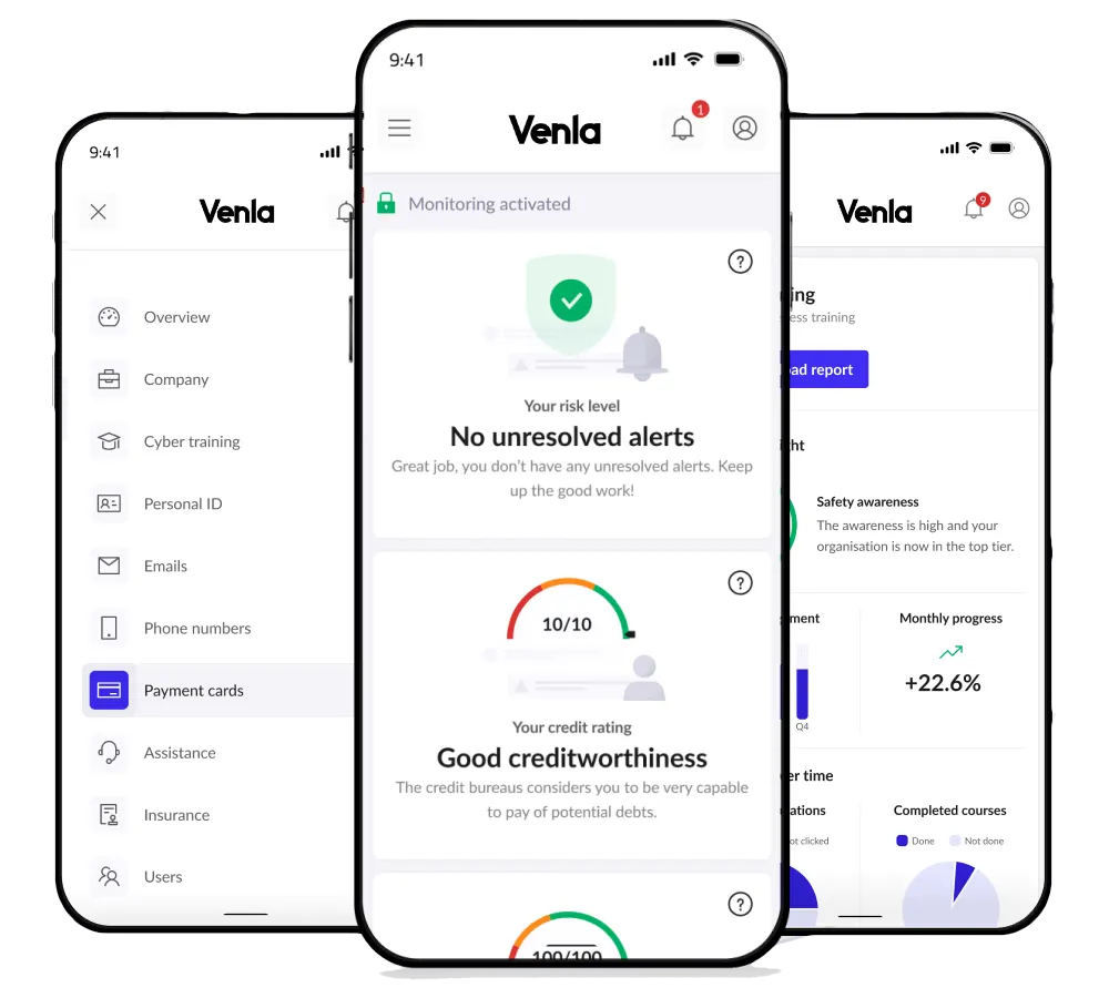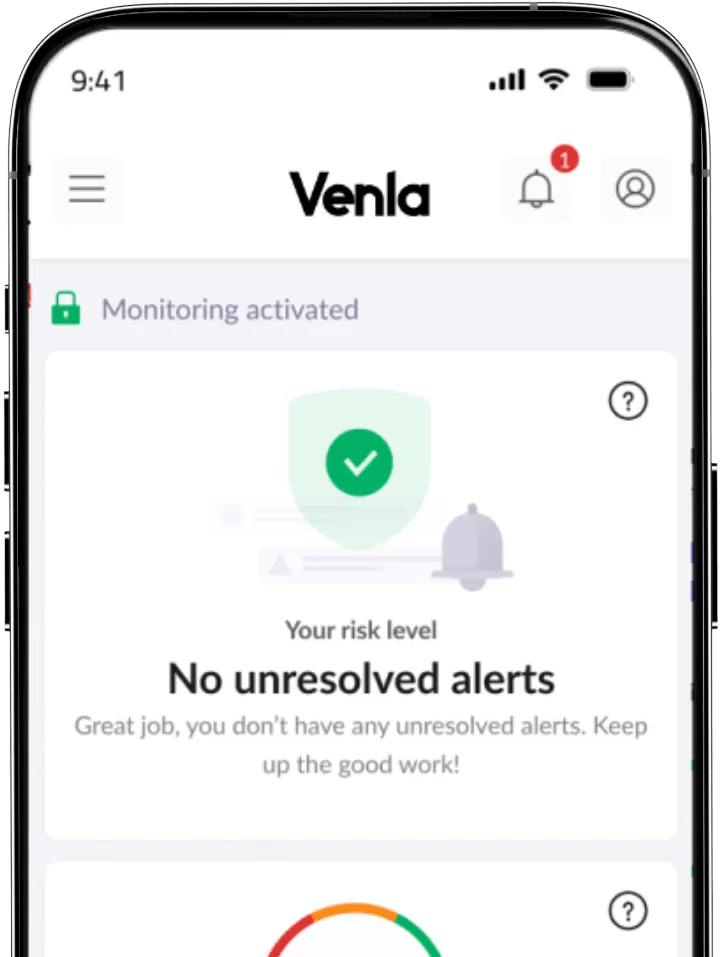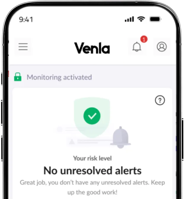 Venla övervakar om din personliga information – som personnummer, kontouppgifter och andra känsliga data – läcker ut på Darknet eller i offentliga register. Du får snabba varningar vid tecken på identitetsstöld, inklusive misstänkt användning av dina uppgifter, fordon eller fastighetsinnehav.